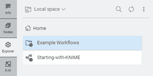 Space Explorer (Explorer) - A file browser that lets you navigate your KNIME Hub spaces or your local KNIME workspaces. It helps you open, organize, and manage workflows, components, data files, and KNIME Hub content in one place.